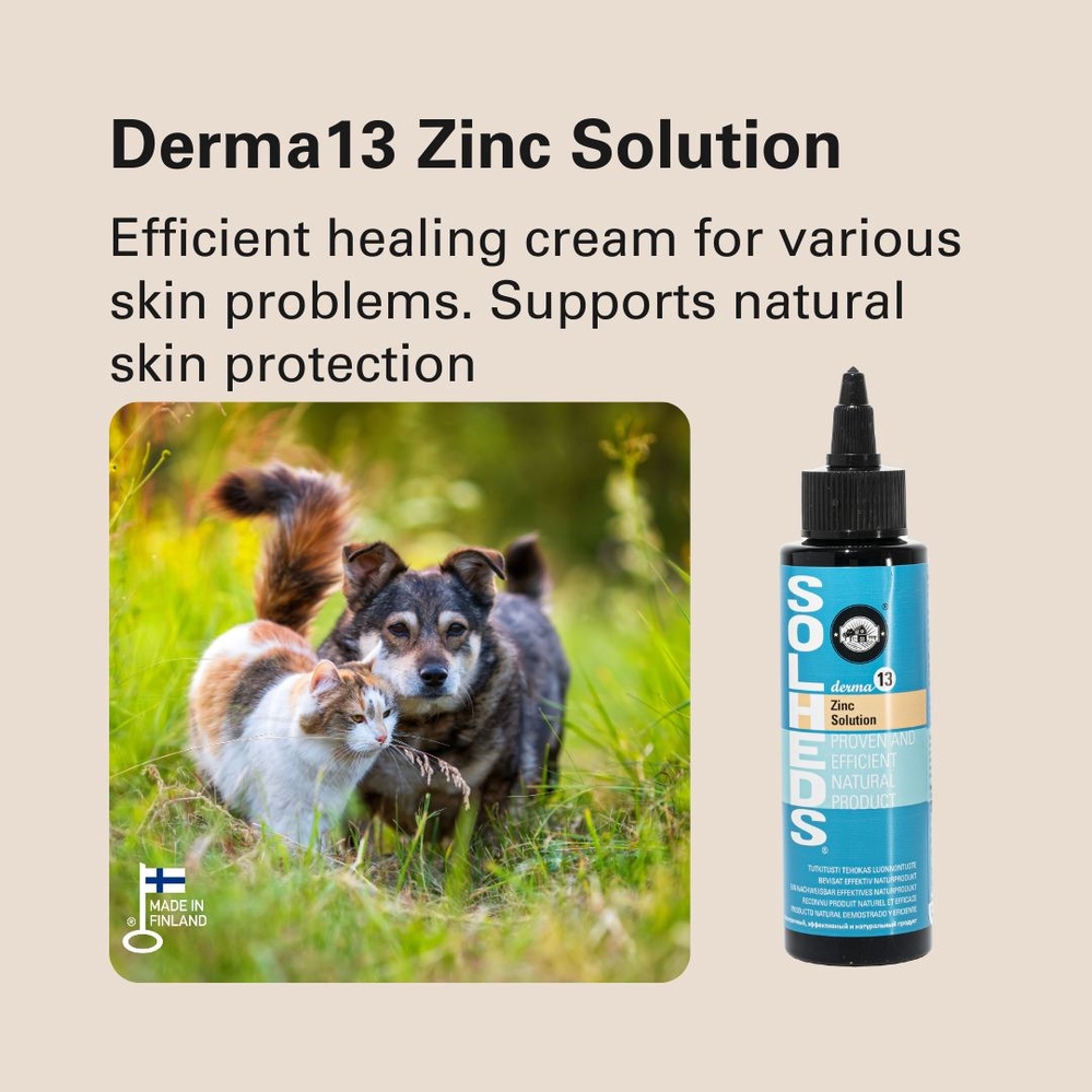 Derma13 tsinkkreem on valmistatud puhastest ja naturaalsetest koostisosadest. Derma13 on testitud ja tõhus abi nahaprobleemide puhul, nagu näiteks nahainfektsioonid hobustel (prei). Toode on eriti sobilik eritisega infektsioonide korral. Kreemis sisalduv tsink aitab vähendada nahakahjustusi. Derma13 toetab naha uuenemist oomega 3, -6, -7 ja -9 rasvhapetega ning aitab pehmendada koorikuid ja arme. Täiendavat abi nahaprobleemide korral võib leida teistest Derma sarja toodetest.