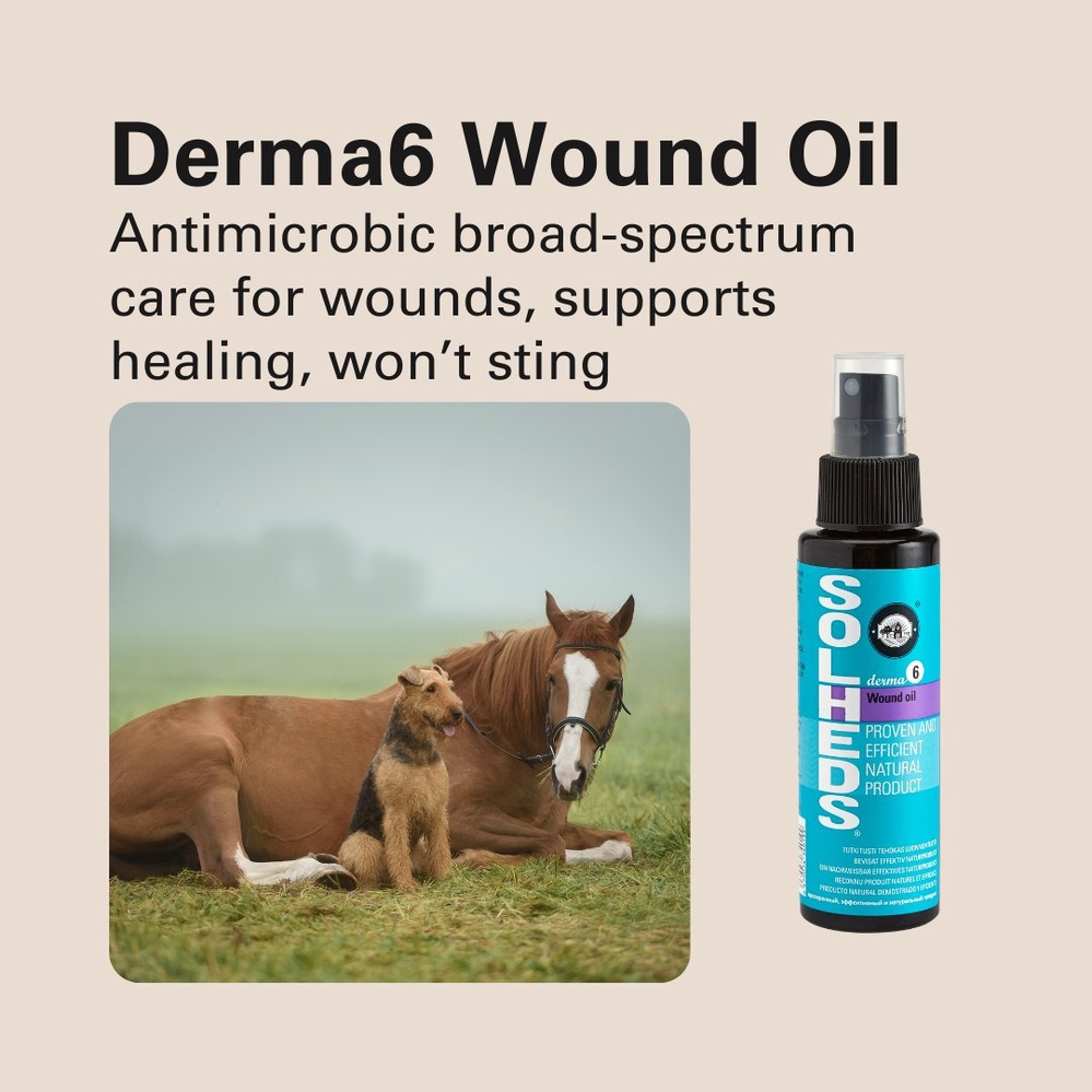 Derma6 haavaõli on tehtud puhastest ja naturaalsetest koostisosadest. Derma6 on testitud ja efektiivne mitte-kipitav abi hoolitsemaks haavade eest hobustel ja koertel. Naturaalsed eeterlikud õlid Derma6-s aitavad vähendada nahakahjustusi. Derma6 õli toetab naturaalsete eeterlike õlide ja oomega 3, -6, -7 ja -9 rasvhapetega naha uuenemist. Derma6 õli on, eelkõige suvisel ajal, suurepärane vahend hoidmaks arme ja haavu puhtana isegi putukatest ja kärbestest. Derma6 on ideaalne toode silmadele, mis eritavad rohkelt rähma, ning neid ümbritsevale nahale. Haavaõlis sisalduvad eeterlikud õlid teevad ravitud koha lakkumise koerte jaoks tihti ebamugavaks.