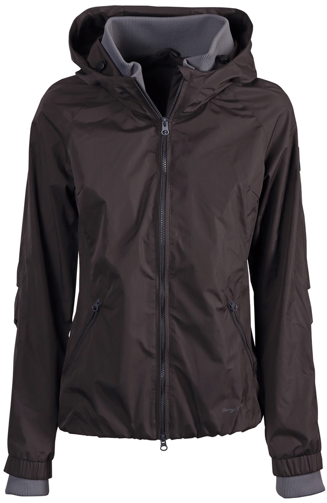 Lühike veekindel jope kahesuunalise lukuga, kahe lukuga küljetaskuga, sisemise taskuga, kapuutsiga, pehme kraega ja varrukatel olevate tuulutusavadega. EQS märk varrukal.