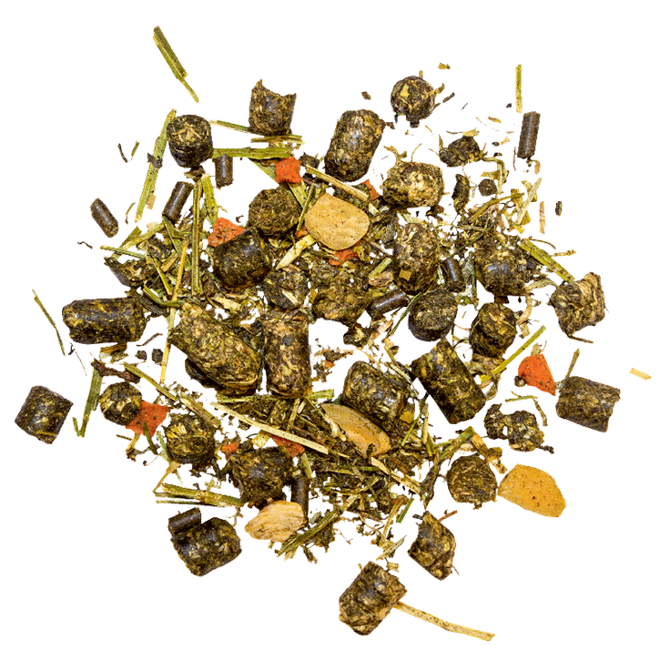 Koostis: püsirohumaa saadused, kuivatatud, pelleti kujul 82%, raf. rapsiõli 5%, kuivatatud lutsern 4%, porgand (helbed) 3%, viinamarjapulp 1,2% naatriumkloriid 0,9%, kaltsiumkarbonaat 0,7%, küüslauk (helbed) 0,5%, linaseemned 0,5%, kaltsiumfosfaat 0,5%, magneesiumoksiid 0,35%, õllepärm 0,25%